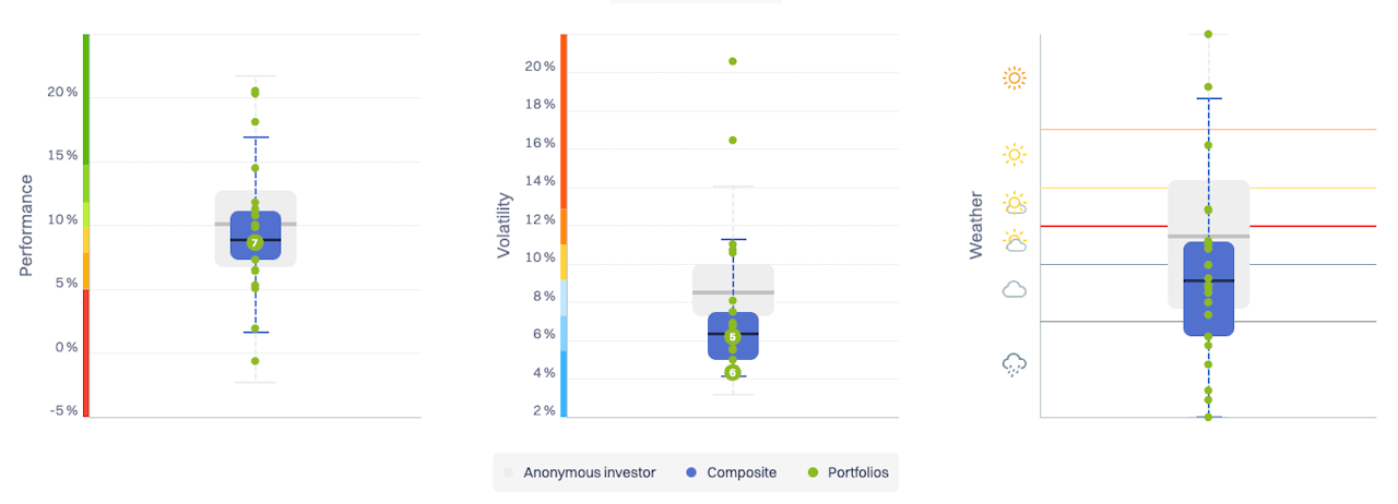 Der graue Boxplot im Hintergrund repräsentiert die Performance-Watcher-Community für dieselbe Währung und dasselbe Risikoniveau.