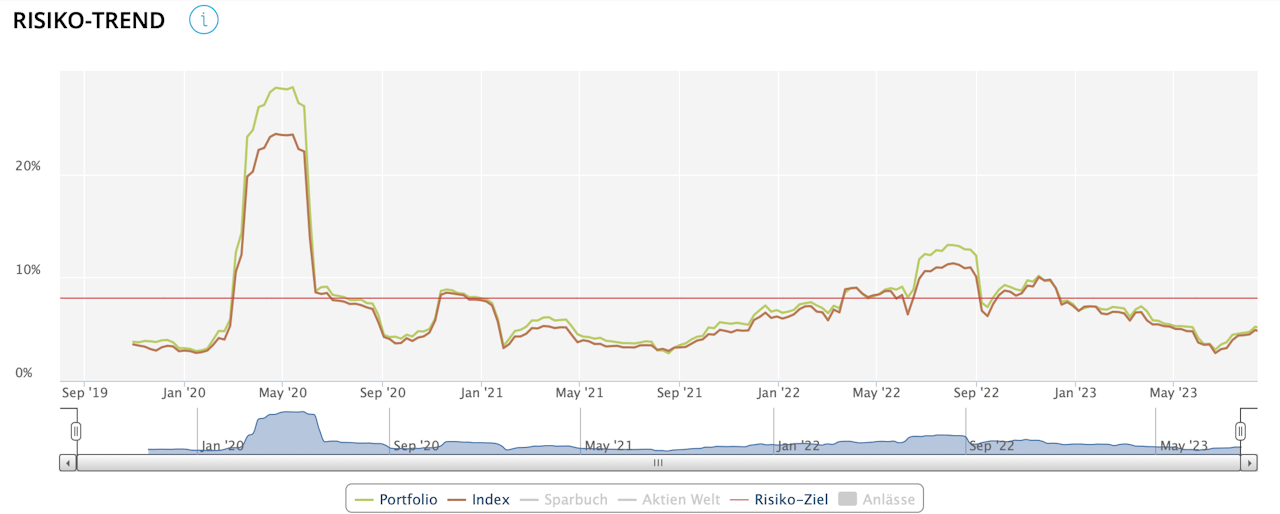 Diese Grafik zeigt die annualisierte Volatilität der täglichen Performance über 3 rollende Monate. Die Legende ermöglicht es Ihnen, das Portfolio, den Index, das Sparkonto und die globalen Aktien gleichzeitig auszuwählen.