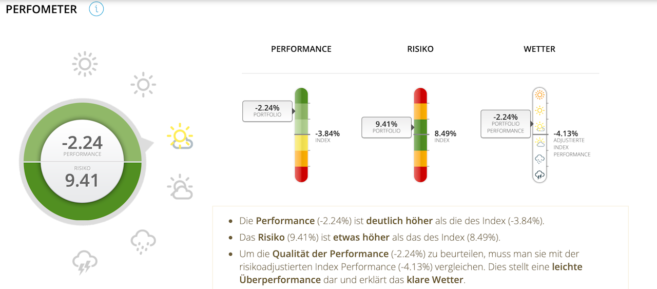 Je größer die Outperformance im Vergleich zum bereinigten Index ist, desto höher ist der Schieberegler (Sonne). Umgekehrt ist der Schieberegler umso niedriger positioniert, je schlechter die Wertentwicklung im Vergleich zum angepassten Index ist (Gewitter).