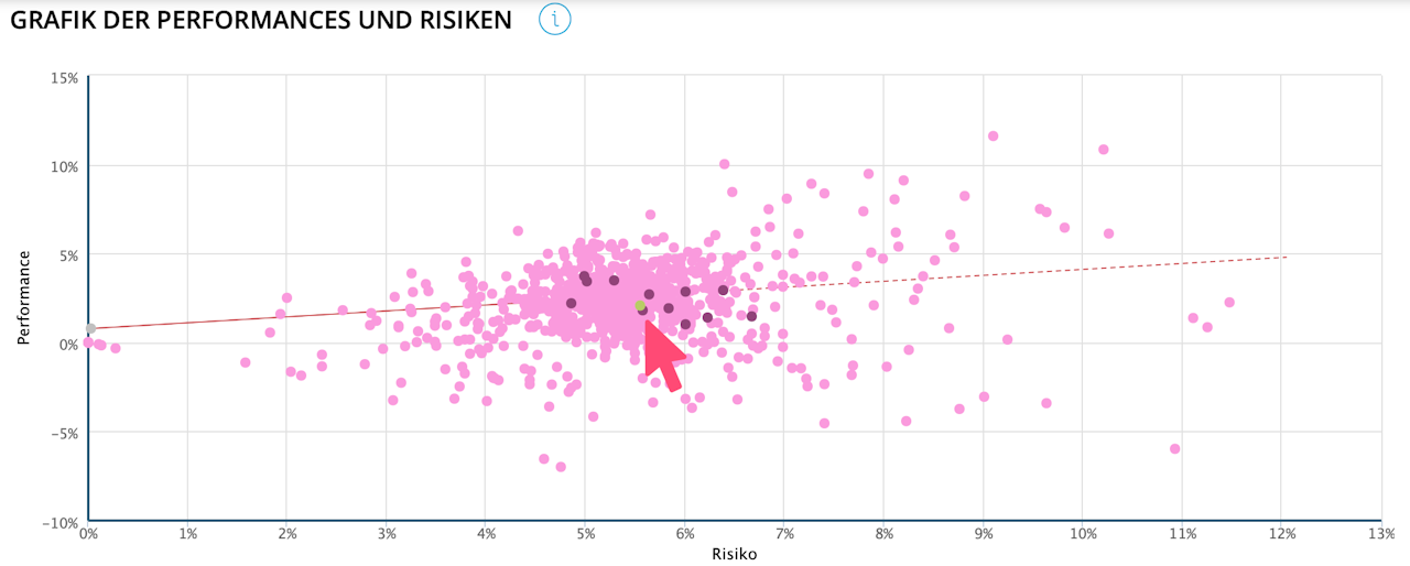 Diese Grafik zeigt in einem Rendite-Risiko-Rahmen jedes Portfolio des ausgewählten Filters sowie weitere in der Legende näher erläuterte Indizes, darunter den Benchmark.
