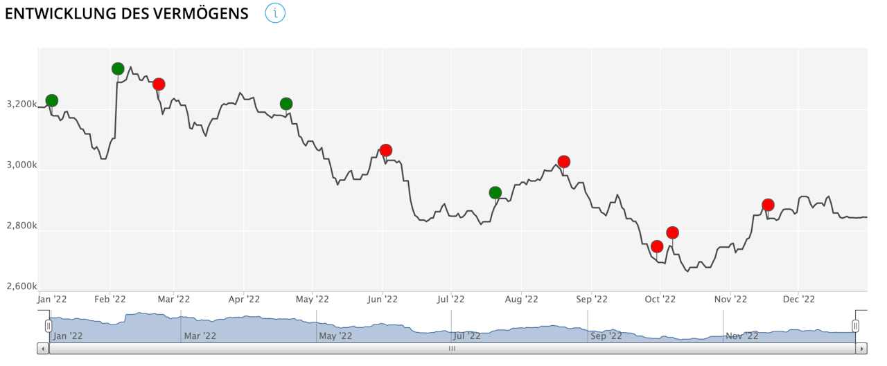 Diese Grafik zeigt die Entwicklung des Vermögens in der gewählten Währung.