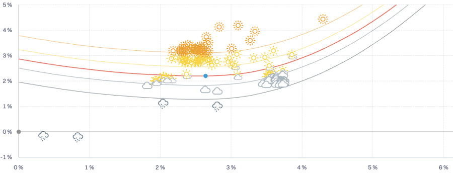 Die Wetterlinien zeigen, wie sich ein Instrument in Risiko und Rendite im Vergleich zu seinem Referenzindex positioniert.