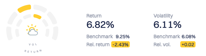 In der Mitte der Performance-Anzeige werden beim Bewegen des Mauszeigers über das Wettersymbol die relative Performance und die Rendite des Referenzinstruments, bereinigt um die Volatilität des Referenzinstruments, angezeigt.