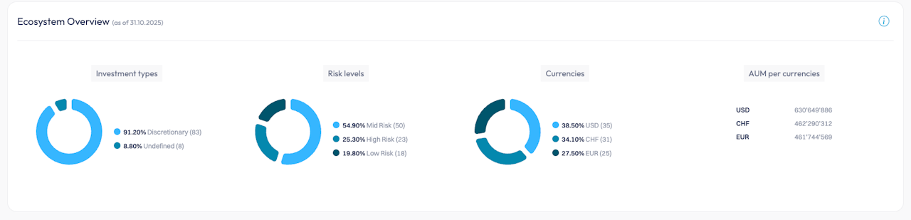 Diese Tortendiagramme zeigen die Verteilung der Instrumente im Ökosystem zum letzten verfügbaren Datum nach Art der Anlage, Währung und Risikostufe. Die Verteilung erfolgt durch Zählung der Anzahl der Portfolios.