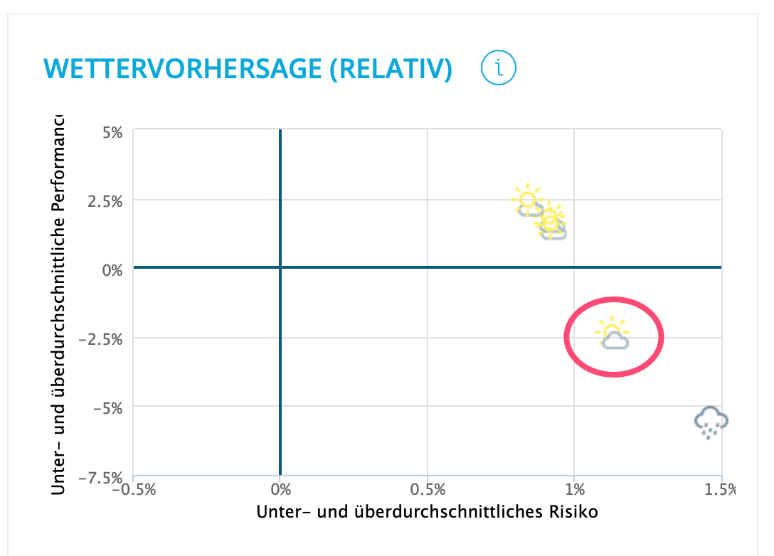 Jedes Portfolio wird durch ein Symbol veranschaulicht, das die Größe der risikobereinigten Outperformance/ Underperformance darstellt, die von "sonnig" bis "stürmisch" reicht.