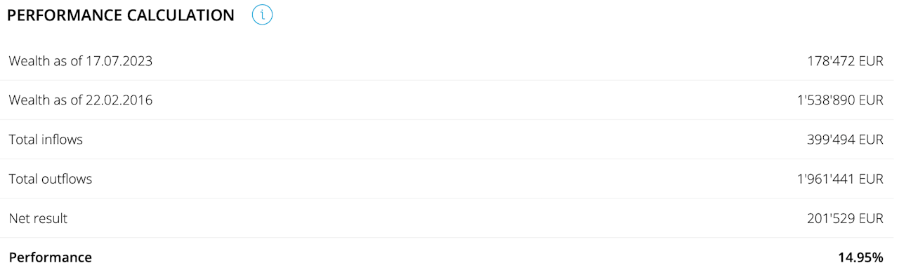 This table shows the change in assets over the selected period, as well as contributions to and withdrawals from the selected portfolio, to calculate the net performance.
