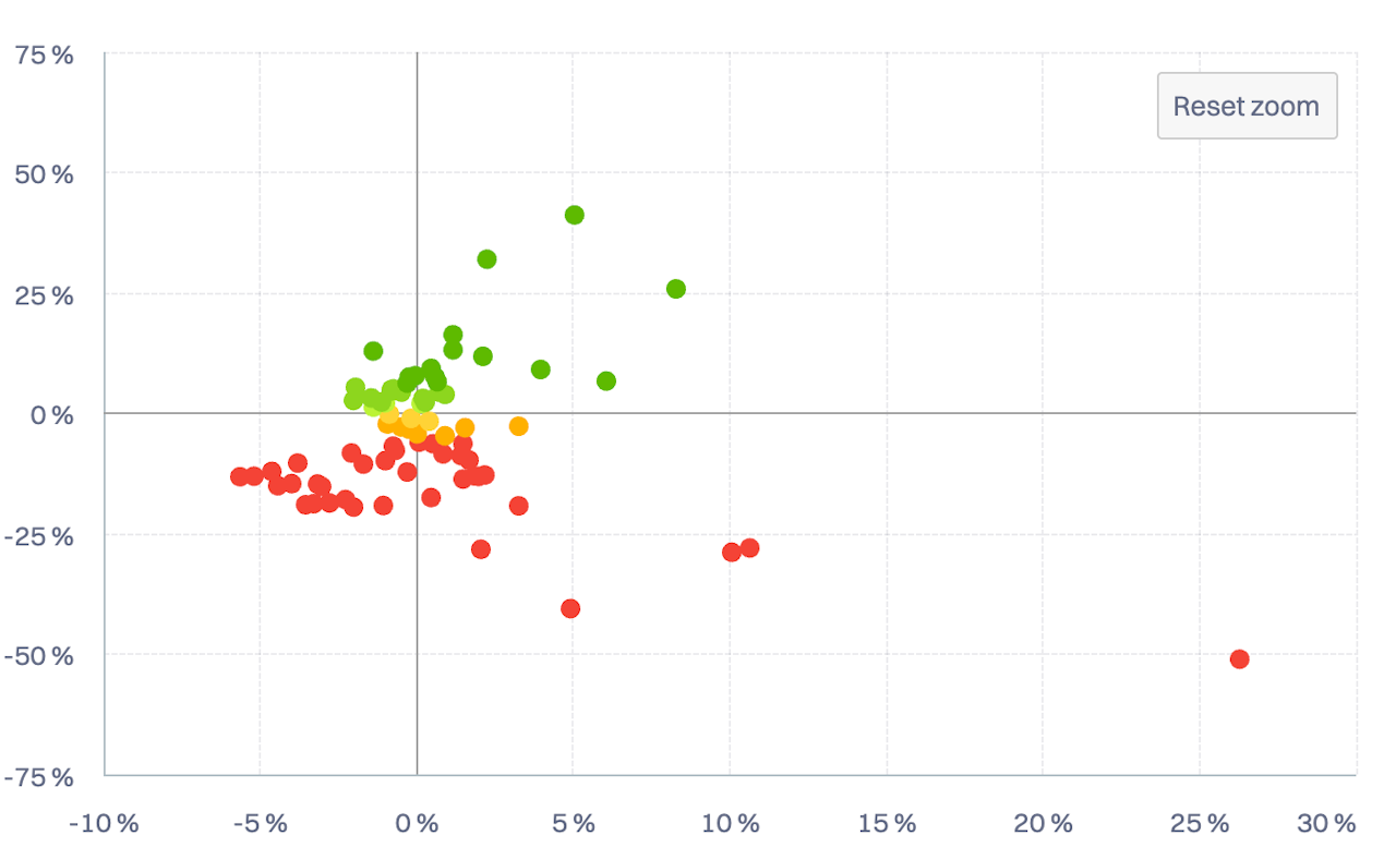 La couleur des points indique la sous-performance (en rouge) ou la surperformance (en vert) du portefeuille par rapport à l'indice de référence PW correspondant au niveau de risque et à la devise de référence choisis.