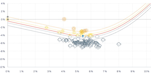 Their shape adapts to the market regime:In positive markets, instruments taking too little risk are slightly penalised (opportunity cost), while those taking too much risk are penalised exponentially. Around the index, Weather improves with better risk-adjusted returns.
