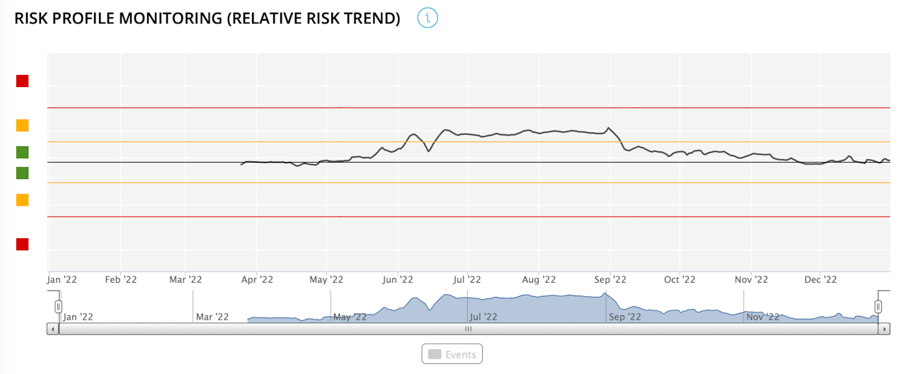This graph shows the 3-month moving average of the realised risk level of the portfolio compared with that of the selected index since the start of the chosen period (3 months, current year, last year, entire period, other period).