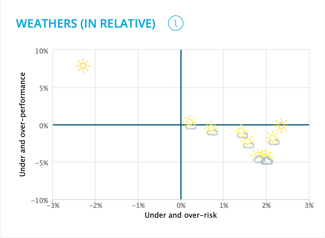 Each portfolio is illustrated by a symbol representing the size of the risk-adjusted outperformance/underperformance, ranging from 'sunny' to 'stormy'.