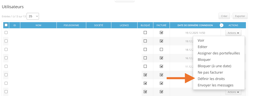 Dans le panneau utilisateur, sélectionnez « Définir les droits ».