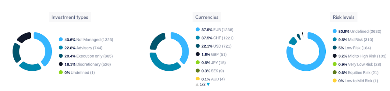Ces camemberts montrent la répartition des instruments dans l'écosystème, à la dernière date disponible, par type d'investissement, devise et niveau de risque. La répartition se fait par décompte du nombre de portefeuilles.