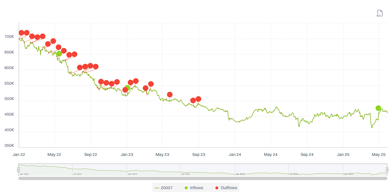 Les points rouges représentent les retraits effectués sur le compte, tandis que les points verts correspondent aux contributions. Une vignette avec la date et le montant du flux s'affiche en s'approchant d'un point.