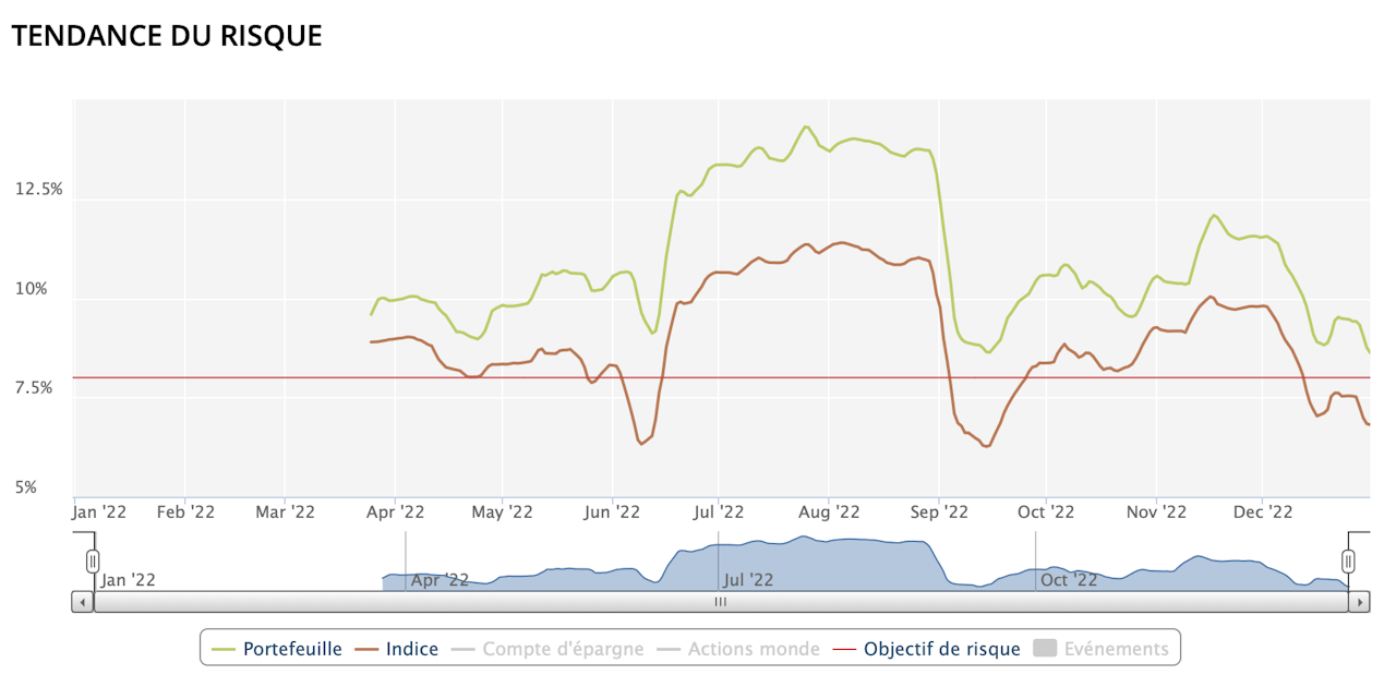Ce graphique montre la volatilité annualisée sur 3 mois roulants des performances journalières. La légende permets de sélectionner simultanément le portefeuille, son indice, le compte épargne et les actions monde.
