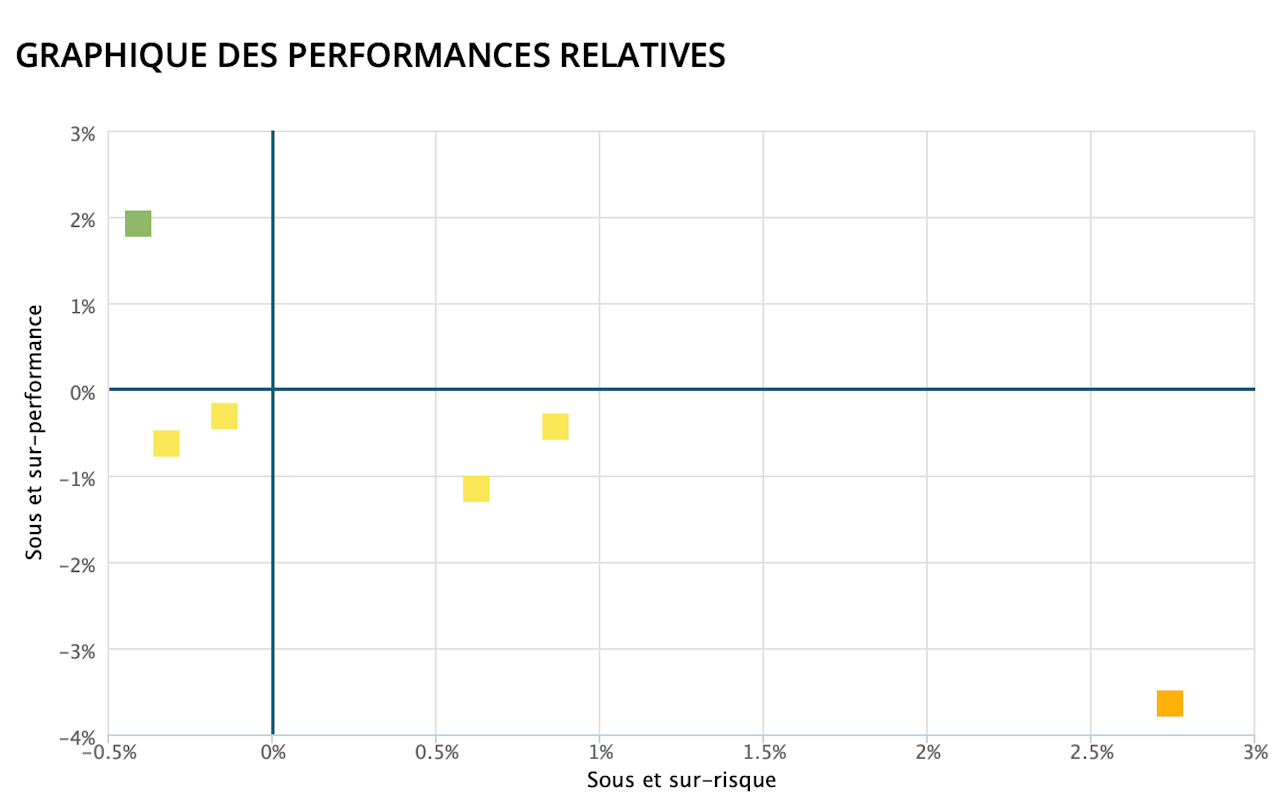 La couleur des points indique la sous-performance (en rouge) ou la surperformance (en vert) du portefeuille par rapport à l'indice de référence PW correspondant au niveau de risque et à la devise de référence choisis.