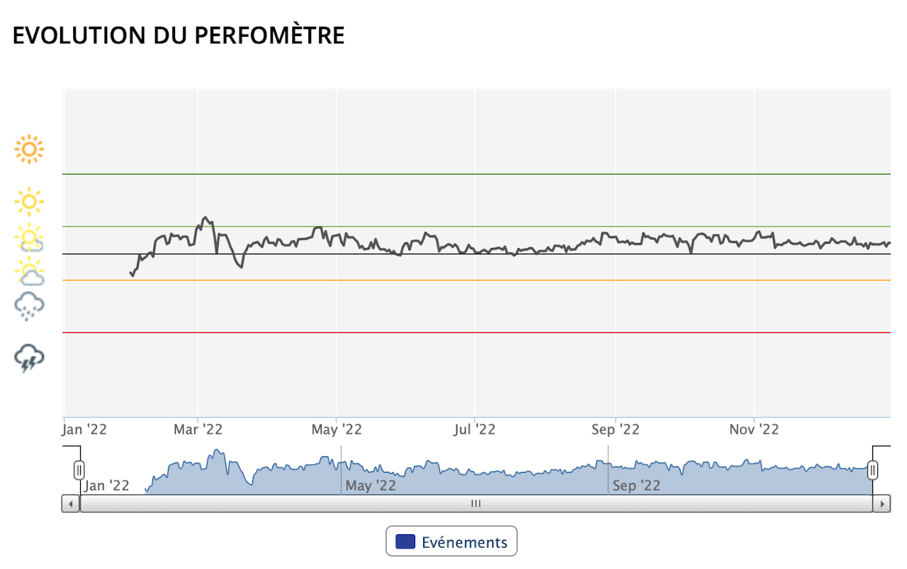 Ce graphique montre l’historique du perfomètre du portefeuille pendant la période choisie – les données apparaissent à partir d’un mois après le début de la période.