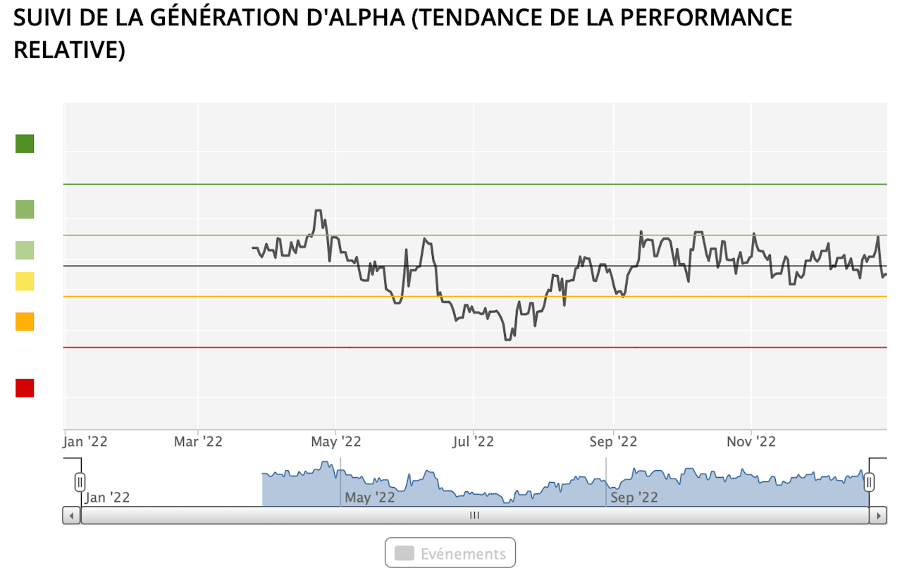 Ce graphique illustre la moyenne mobile 3 mois de la sous/surperformance du portefeuille par rapport à l’indice sélectionné depuis le début de la période choisie (3 mois, années en cours, année dernière, toute la période, autre période).