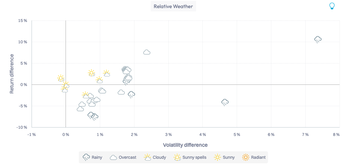 Ce graphique permet de visualiser, dans un cadre rendement-risque, la météo des instruments du filtre sélectionné par rapport à leur indice de référence.