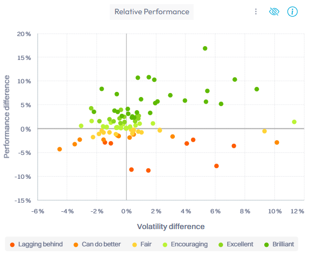 La couleur des points indique si l'instrument a sous-performé (rouge) ou surperformé (vert) l'indice de référence PW pour le niveau de risque et la devise de référence choisis.