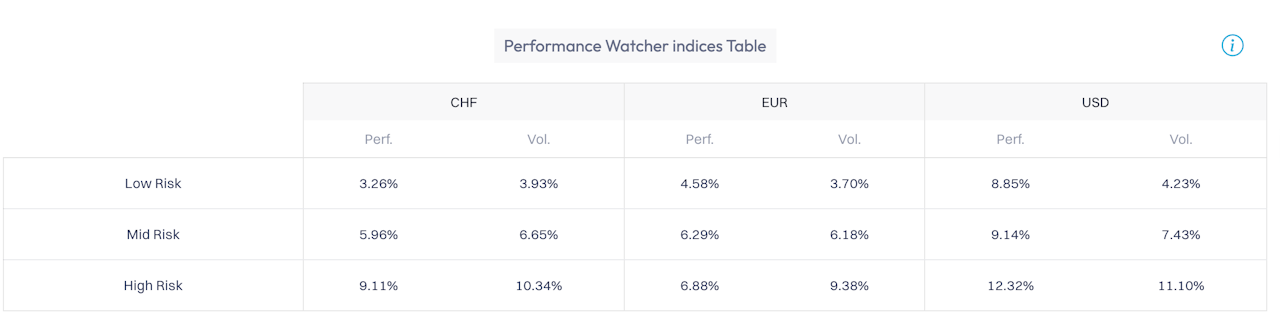 À l'aide du filtre global du tableau de bord et en s'appuyant sur les devises et les niveaux de risque sélectionnés, le tableau affiche les performances cumulées et la volatilité annualisée.