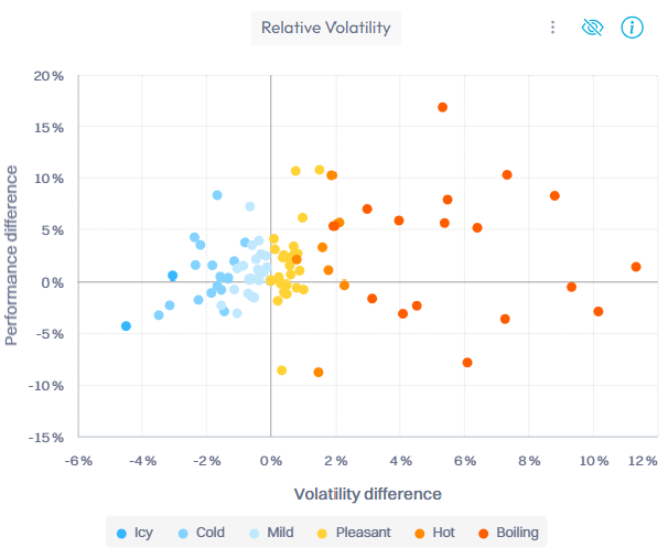 Chaque portefeuille est illustré par un symbole représentant la valeur du sur ou sous-risque, bleu (glacial) à rouge (bouillant).